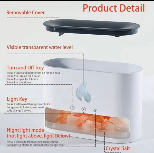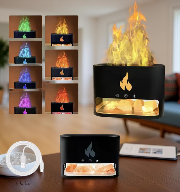 Crée une ambiance chaleureuse et apaisante avec notre diffuseur à effet flamme. Conçu avec des pierres de cristal et une lumière LED multicolore, il combine humidificateur d'air, veilleuse relaxante et élément décoratif.